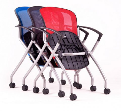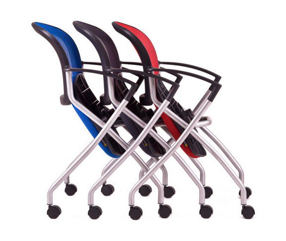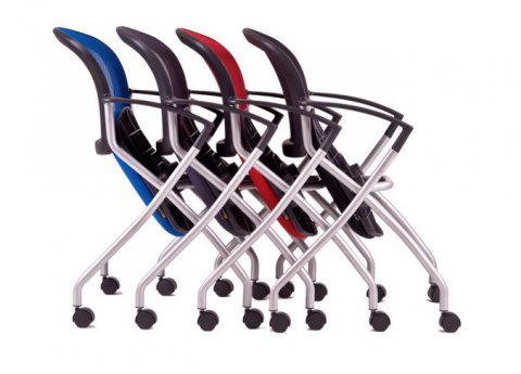 Horizontálně stohovatelná konferenční židle se sklopným sedákem.