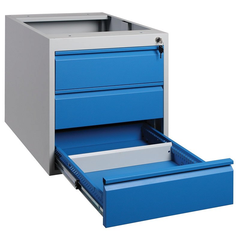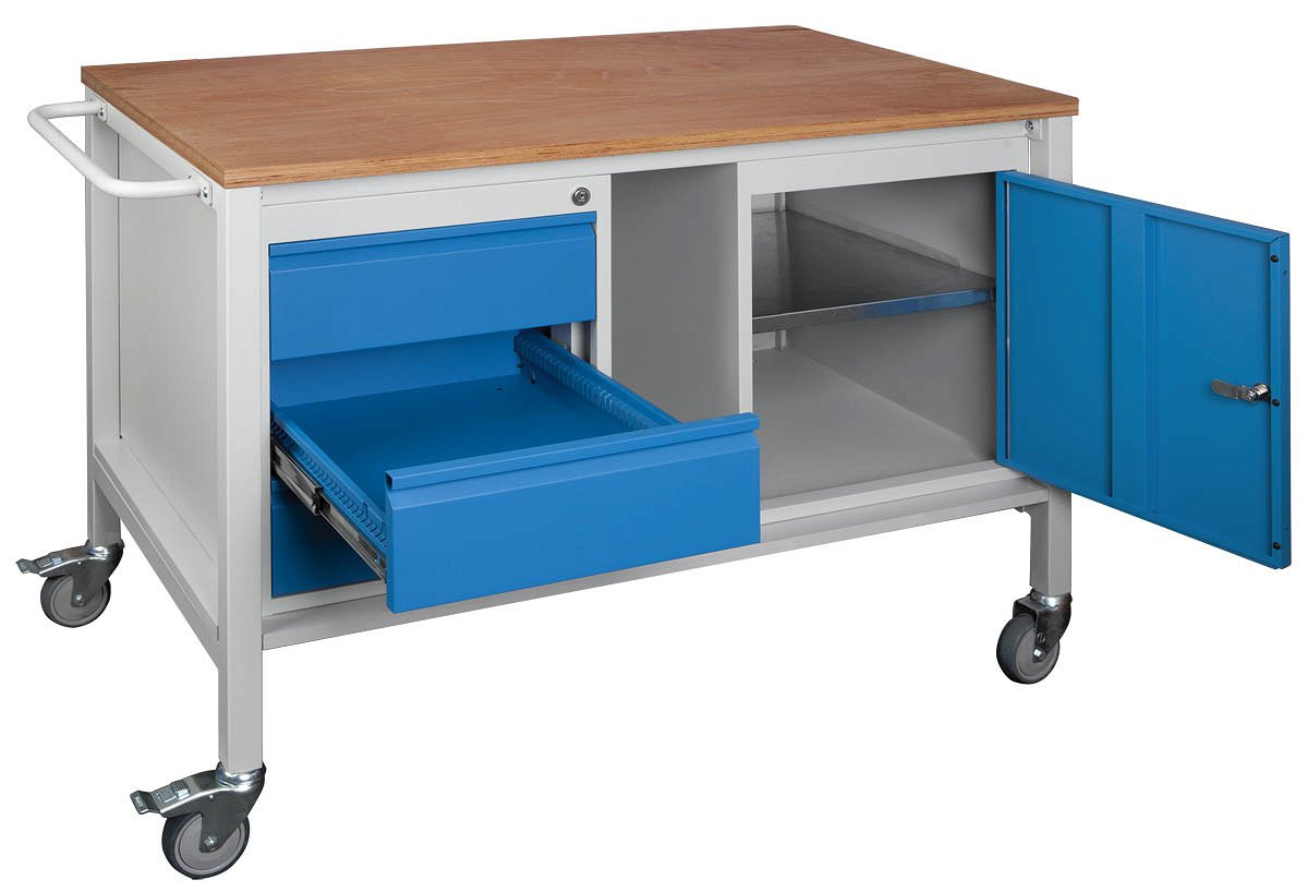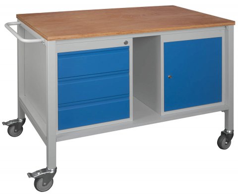 Pojízdný montážní stůl se třemi zásuvkami a skříňkou, 1200 x 700 mm. celý popis