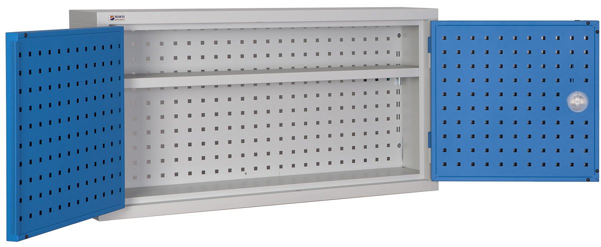 • zadní stěna skříňky a vnitřní plochy dveří jsou perforovány pro zavěšení držáků nářadí (rozteč 38 x 38 mm, rozměr 10 x 10 mm)